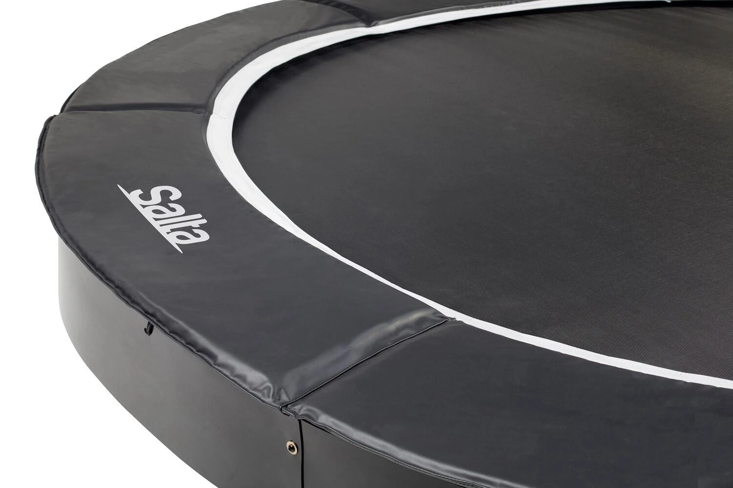 The outside of the Royal Basegroud is equipped with sturdy panels, ensuring a very stable foundation. The durable, sturdy frame and double galvanised frame is black powder coated to fight corrosion. The black safety pad is made from solid, high-quality PVC material. The convenient net system attached to the safety pad, makes it impossible for children to come into contact with the springs. Furthermore, the safety pad seamlessly blends with your grass, making the frame invisible and allowing children to easily access the trampoline.