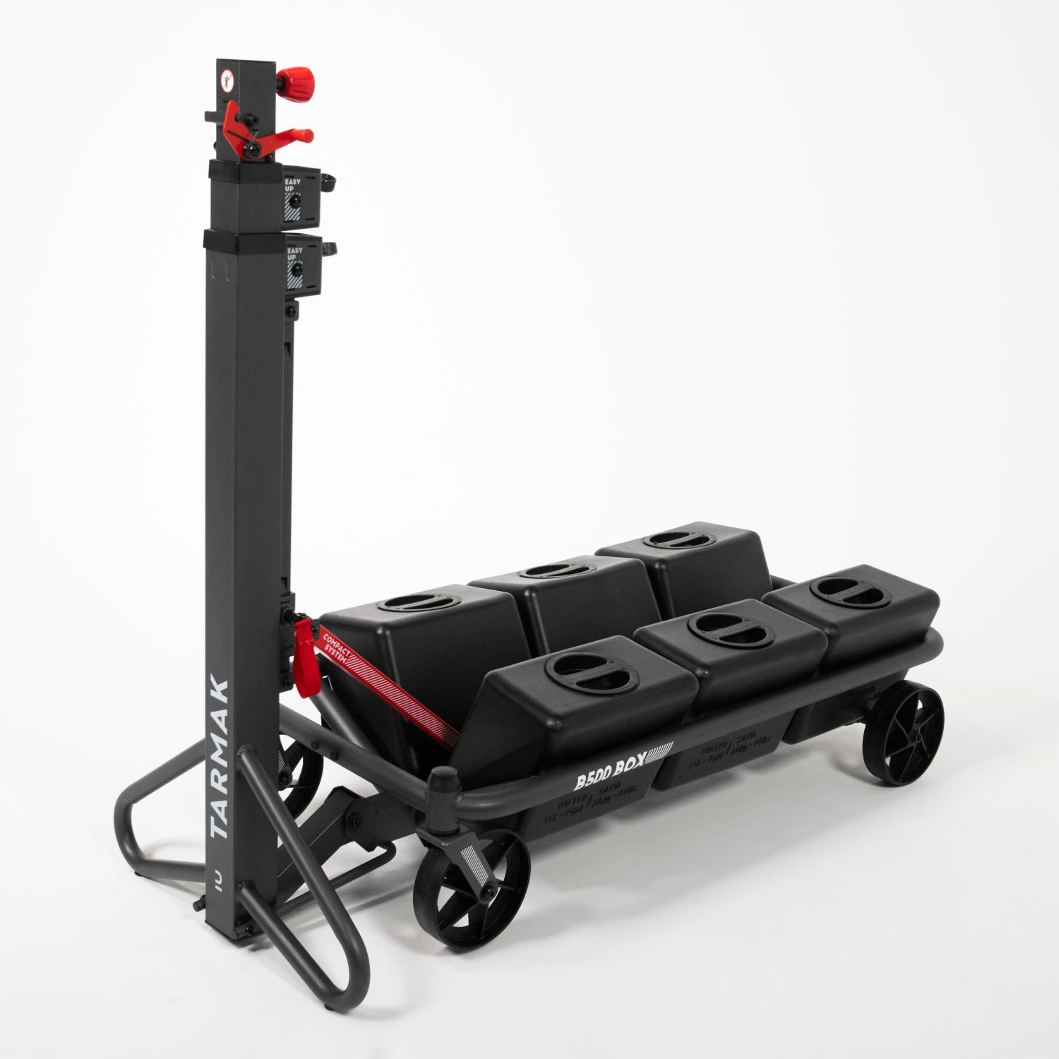 The B500 Box is very mobile. With its big wheels, it can go over any obstacles (steps, pebbles etc.) which makes it easy to move it from storage to the playing area.