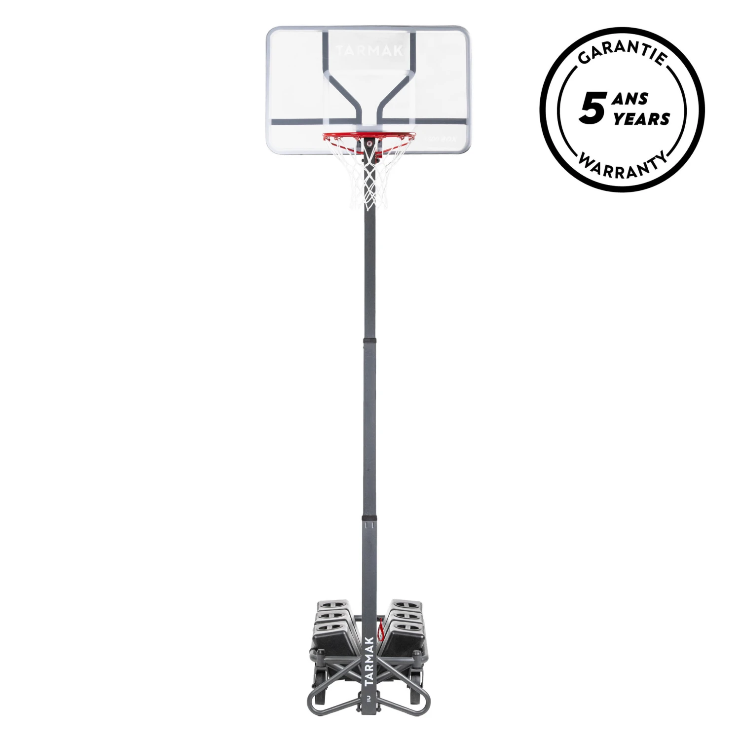 B500 Box basketball basket suitable for kids and adults playing basketball outside. Crank adjustment from 2.40 m to 3.05 m.Folds and unfolds in 1 minuteThis moveable basketball hoop is incredible. Incredibly space-saving, can be set up and stored away in 1 minute without tools. Very easy adjustment and high bounce quality.