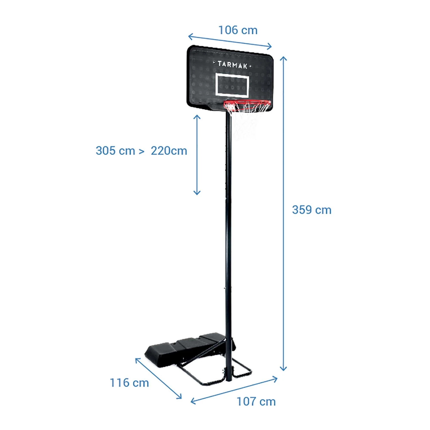 B100 basketball basket suitable for kids and adults playing basketball outside. Adjusts from 2.2m to 3.05m.This basketball basket and stand is perfect for getting started. It offers 5 heights ranging from 2.20 m to 3.05 m (regulation height).