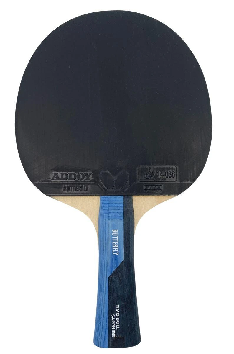 The Timo Boll Saphire features a strong 5 ply blade with an attractive, comfortable Anatomic shaped handle. This combined with Butterfly ITTF approved red and black Addoy rubber with 1.7mm sponge provides a bat with good spin, good speed and excellent control. The edge of the blade is protected by Butterfly side tape.