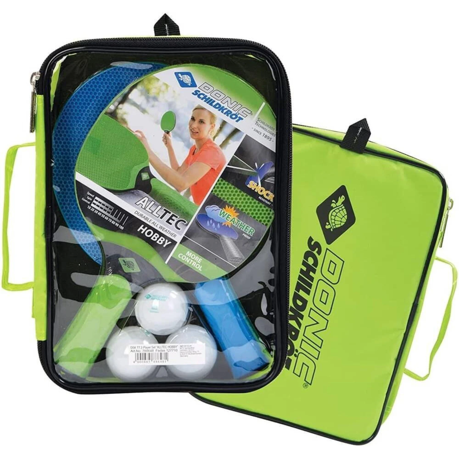 The Alltec set from Schildkrott contains 2 pieces of the new innovative outdoor rackets made of a 2-component plastic. A hard, torsion-resistant core made of dark gray plastic plus a second, injected, soft, non-slip (rubber-like) plastic in green or blue for grip, secure grip, spin, acceleration, etc. These innovative clubs can easily keep up with any mid-range wooden leisure club! At the same time, they are waterproof (so they can sometimes be forgotten in the garden when it rains), they are washable and therefore more hygienic (ideal for public facilities such as schools, youth clubs, parish homes, etc.). They are also much more robust, they can fall down without the wood splitting. The plucking of the topping, which is popular with children, is also not easily possible here. . So there are no disadvantages in playability compared to the classic racket. The clubs are also equipped with an ergo handle – a rounded area in the transition between the handle and the club face – this is simply better and more comfortable to hold. The surface of the racket is also perforated / structured and thus also facilitates the game with cut.