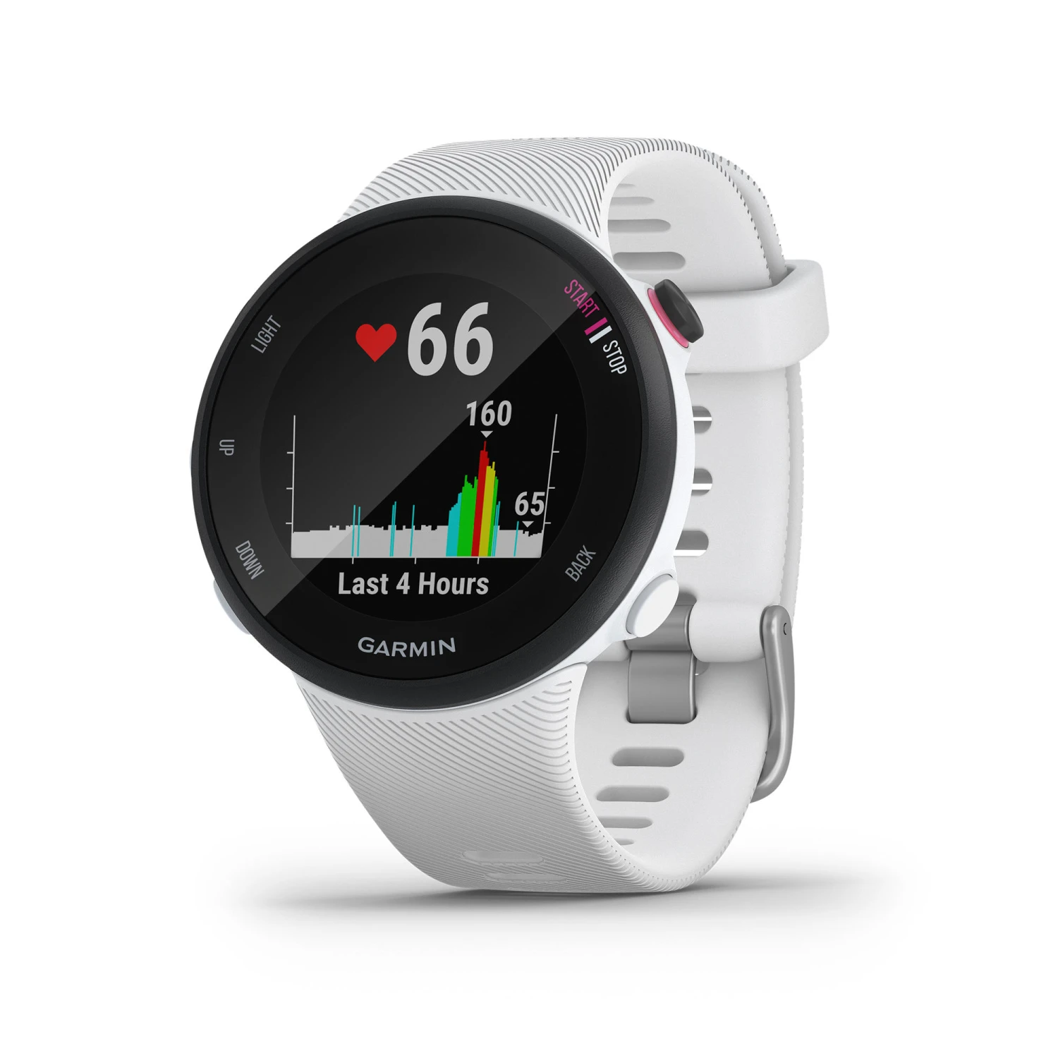 The Forerunner 45 GPS running watch has a comprehensive set of built-in functions to track your activity and monitor your well-being. Wear it 24 hours a day to keep track of your daily step count, the distance you cover, the calories you burn and even your sleep patterns. This smart watch also monitors your stress levels throughout the day, to inform you about your state of well-being.
