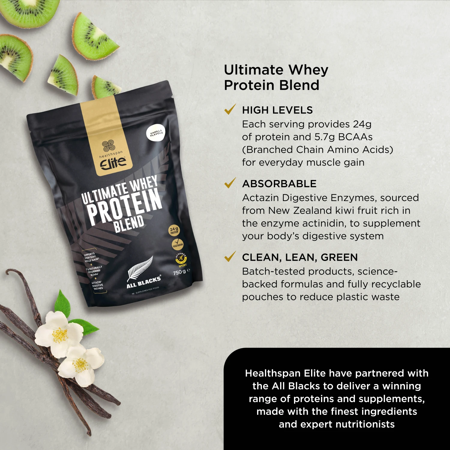 It was important for Healthspan and the All Blacks to launch a range that shared their mutual values. This led to the ‘clean, lean, green’ ethos: Ultimate Whey Protein is fully lab-tested, contains natural flavours and no unnecessary ingredients (Clean), with a science-backed formulation low in sugar to help you achieve your goals (Lean), and uses New Zealand based ingredients within recyclable packaging (Green).