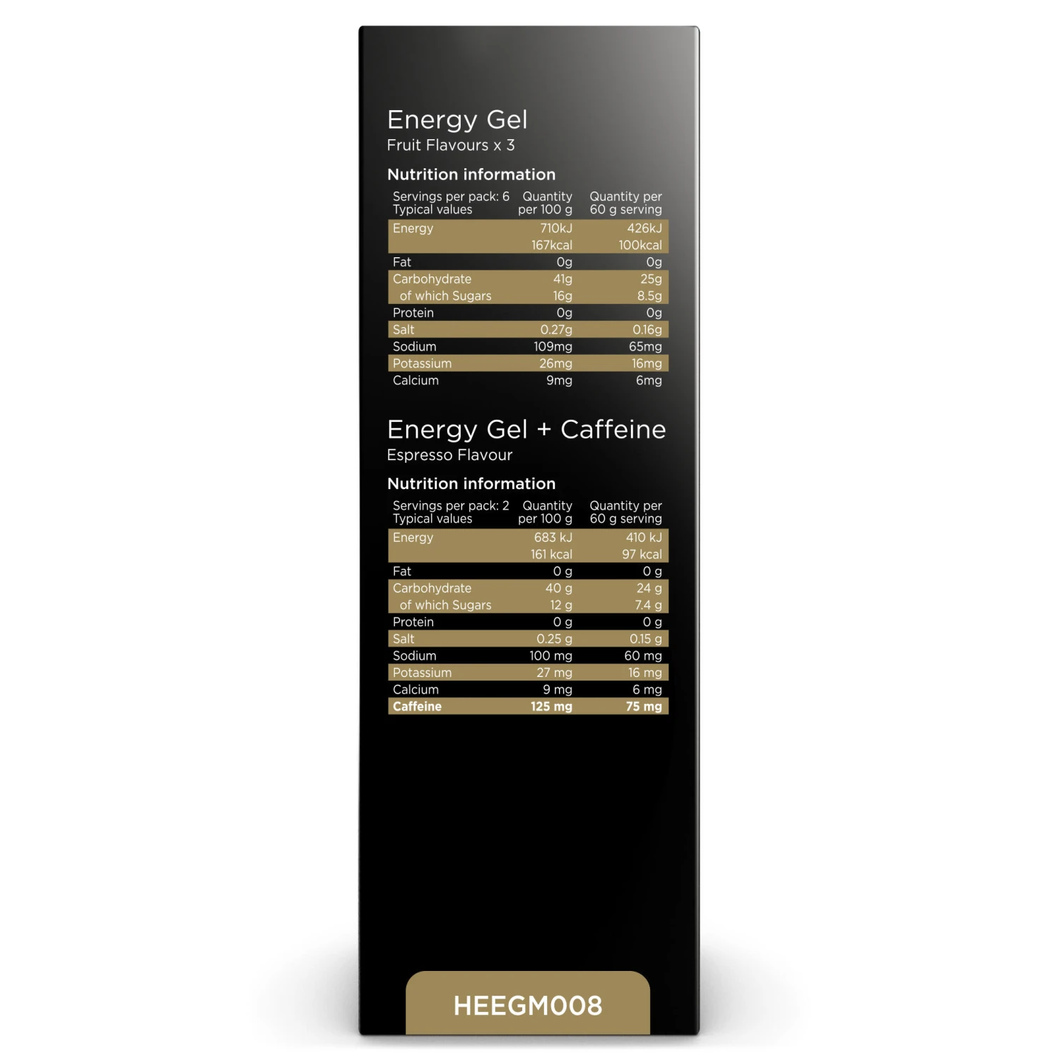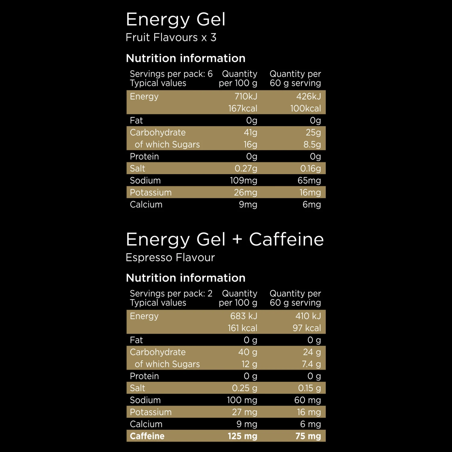 Their standard Energy Gels – in Apple & Blackcurrant, Citrus Fruit and Passion Fruit flavours – contain 25g carbs and 3 electrolytes (sodium, potassium and calcium). Their Energy Gel + Caffeine Espresso flavour provides 24g carbs and 3 electrolytes in addition to 75mg caffeine to give you an extra boost.