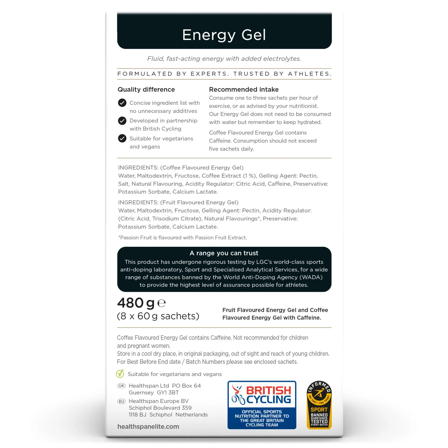 A mixed selection of 8 fast-acting energy gels using authentic, natural flavours: Apple & Blackcurrant, Citrus Fruit, Espresso (with Caffeine) and Passion Fruit.