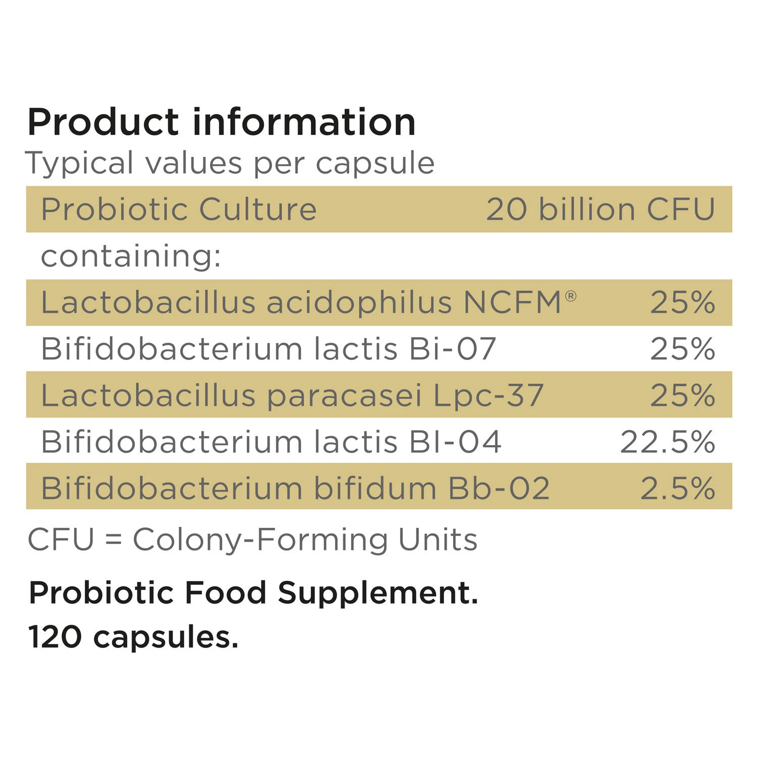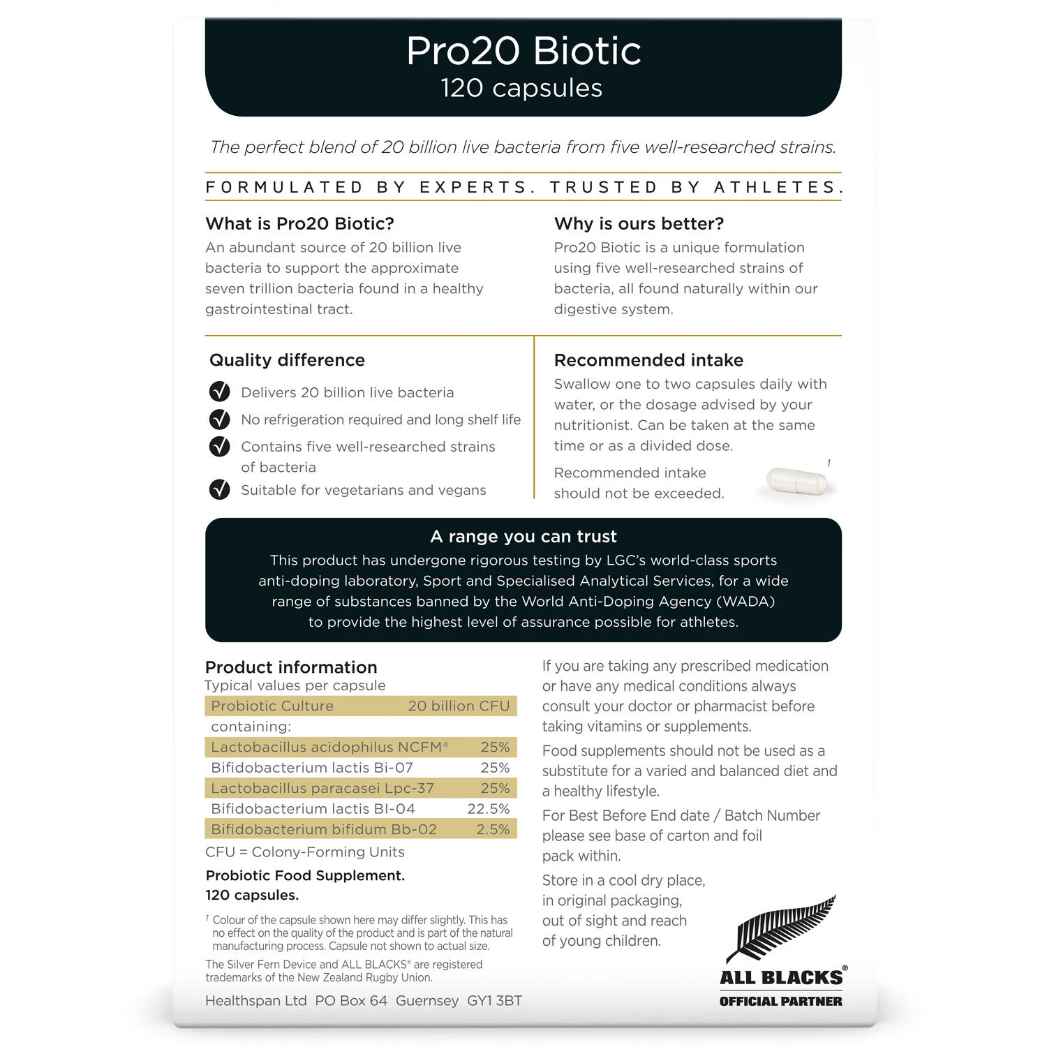 Pro20 Biotic is a unique formulation that has been developed using five well researched strains of bacteria (Bifidobacterium lactis Bi-07, Lactobacillus acidophilus NCFM®, Lactobacillus paracasei Lpc-37, Bifidobacterium lactis Bl-04, Bifidobacterium bifidum Bb-02), the strains that are naturally found within the human digestive system. Manufactured using a proprietary freeze dry process, these bacteria are held in a suspended state before being ‘re-activated’ when the capsule is swallowed, meaning that we can guarantee 20 billion live bacteria will reach your digestive system for optimum efficacy.