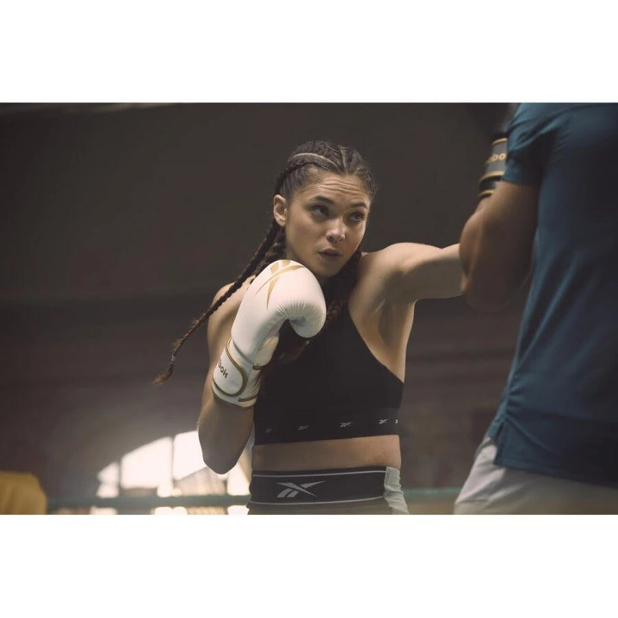 Preparing you for all combat training, the Reebok Gold & White Combat 12oz Boxing Gloves + Wraps Set equips you for bag, pad and sparring sessions.