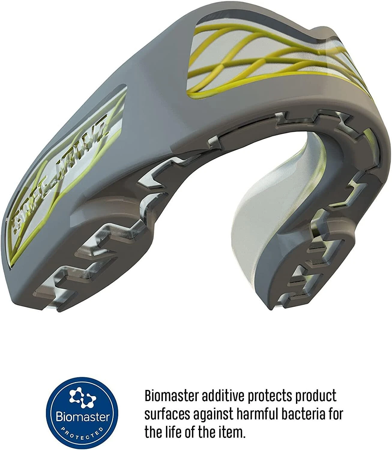 ANTIMICROBIAL – Our Nitro Series range are treated with Biomaster Silver Biocide, protecting its surfaces from bacterial growth for the life of the mouthguard, keeping it fresh and hygienic.
