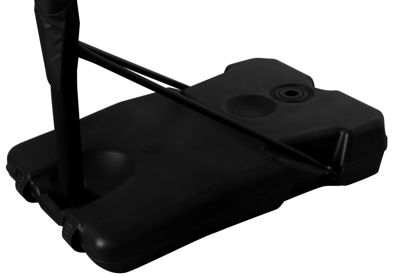The backboard and ring are set on a sturdy 3-piece steel pole with pole padding included as standard for added player protection during play. The unit includes a moulded base that requires water or sand for stability when is use – with two wheels included for easy movement.