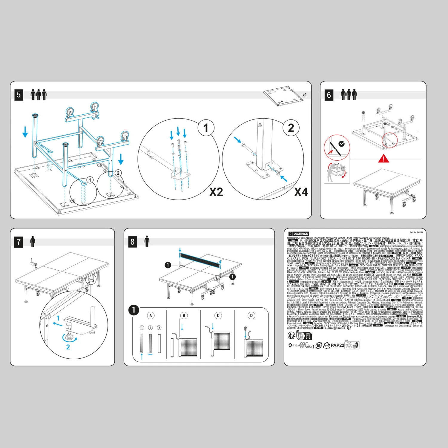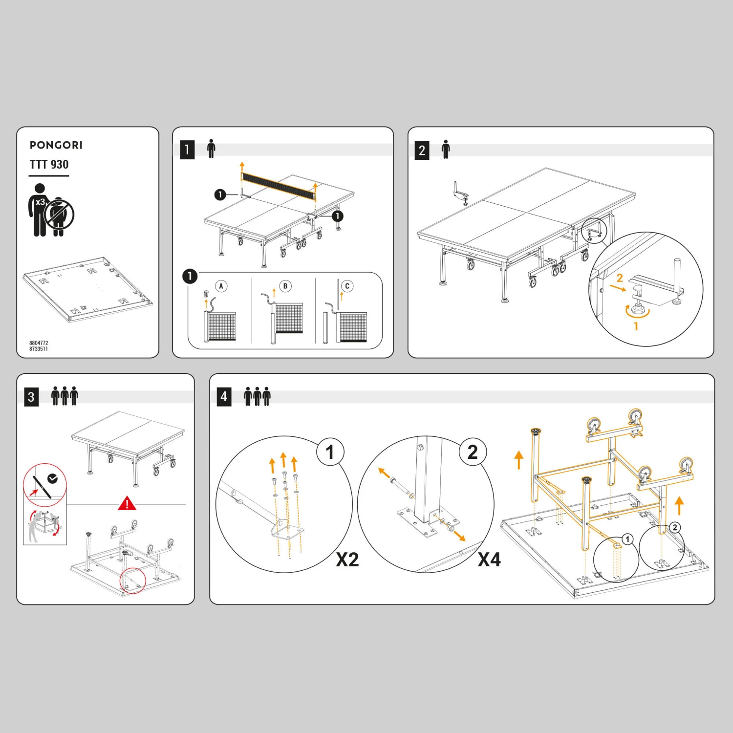 The two safety systems, the brackets that fix the legs in place and the two parts that protect the tabletop when installing the net posts are included with this tabletop.